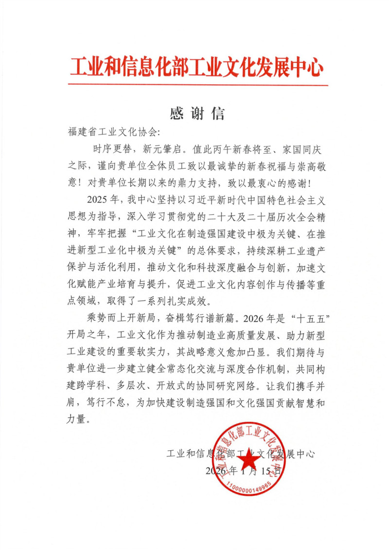工业文化是推动制造业高质量发展、服务新型工业化建设的重要软实力,是凝聚行业精神、传承工业文明、增强产业自信的关键支撑。2026年是“十五五”规划开局之年,工业文化的战略意义日益凸显。展望新征程,协会将与工业文化发展中心进一步深化协同,持续完善常态化交流与深度合作机制,共同构建跨学科、多层次、开放式的工业文化协同网络,携手推动工业文化理论研究和实践创新,为加快建设制造强国和文化强国贡献更多福建智慧与力量。